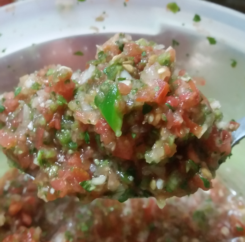 Start by making everything a good size to add to the food processor. We have a small processor so we do small batches. A little tomato, a little onion, a little cilantro, etc.. then pulse till happy with size of pieces.