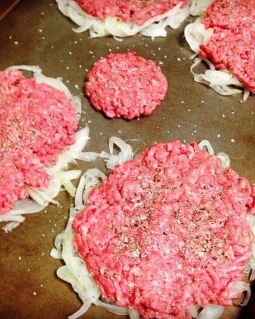 Divide the onions into 4 separate mounds on a rimmed baking sheet. Form the beef into 4 lightly packed balls. Place the beef balls on top of the onion mounds and flatten the beef firmly (use your palm) so the onion adheres to the beef. The patties should measure 4 inches in diameter. Season the beef generously with salt and pepper.